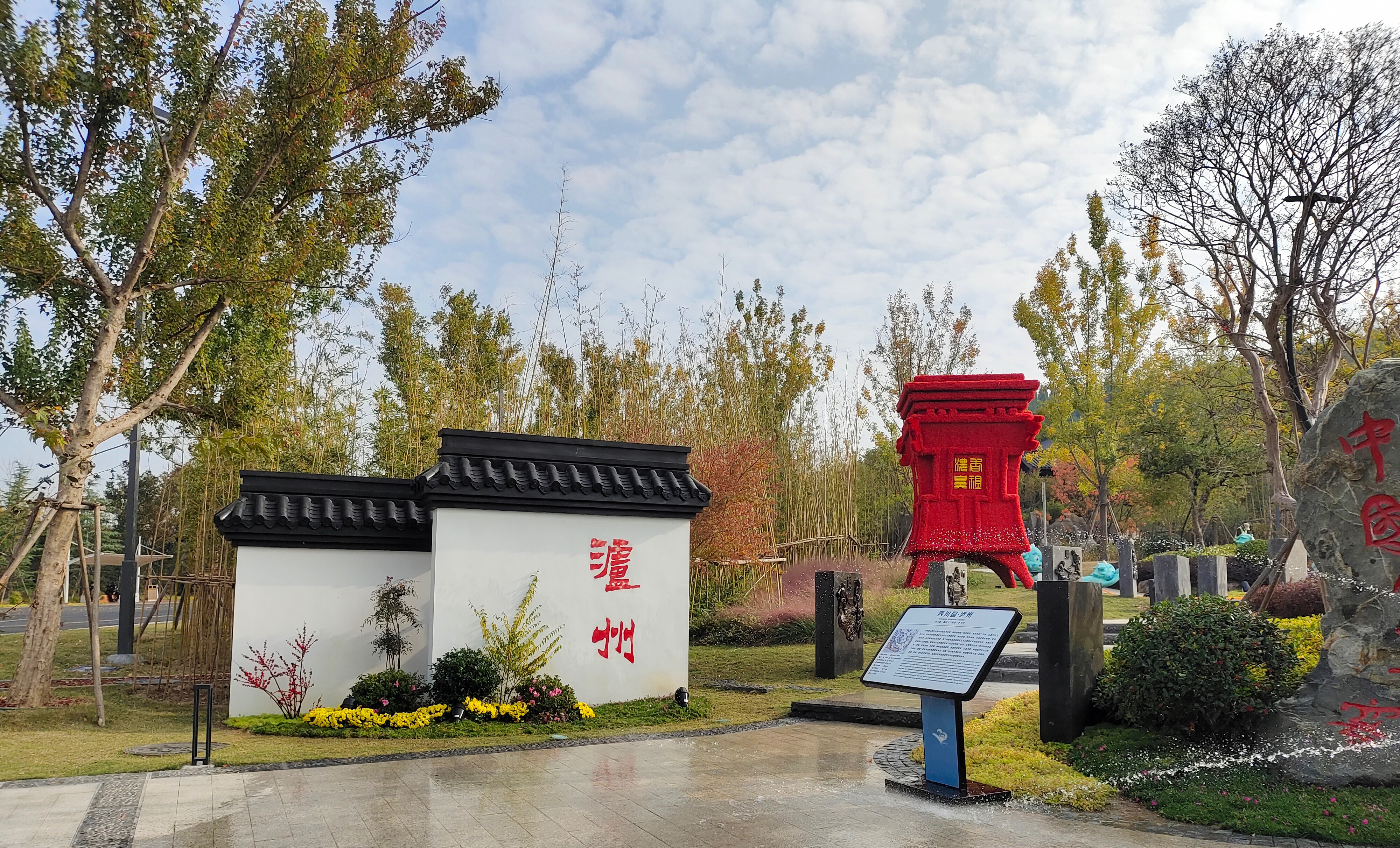此屆園博會(huì)“瀘州園”位于徐州園林博覽會(huì)西側(cè)主入口西南地區(qū)省市展園四川園內(nèi),用地面積1050㎡,承接園區(qū)主入口南風(fēng)禮樂的文化主線,圍繞園博園“綠色城鄉(xiāng),美好生活”主題,以酒文化為切入點(diǎn),提取中國名酒瀘州老窖、郎酒的酒文化景觀元素,通過景墻、綠雕、小品及綠化,以生態(tài)的方式生動(dòng)展現(xiàn)天地人共釀、源自瀘州、際會(huì)徐州、聚匯一城的“酒生活”文化,展現(xiàn)人們“釀”造幸福及對(duì)美好生活的追求和向往,成為本屆園博會(huì)的一大亮點(diǎn)。