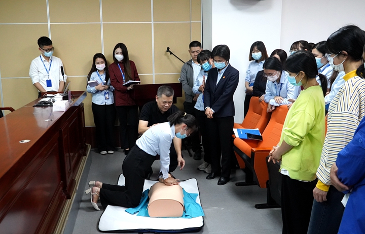 講座采用理論授課及實(shí)踐操作相結(jié)合的方式進(jìn)行,梁宇強(qiáng)以生活中的案例為切入點(diǎn),對(duì)創(chuàng)傷、中毒、溺水、心跳驟停、氣道異物的癥狀及急救技術(shù)作了詳細(xì)的講解,并鼓勵(lì)大家當(dāng)成為突發(fā)意外或傷病“第一目擊者”時(shí),實(shí)施正確有效的急救方法,為傷病者提供第一時(shí)間的救助,贏得寶貴搶救機(jī)會(huì)的黃金時(shí)間。理論授課結(jié)束后,梁宇強(qiáng)以模擬橡膠人為器具,現(xiàn)場(chǎng)演示了正確的心肺按壓和人工呼吸方式,并指導(dǎo)職工們親自動(dòng)手操作。本次講座深入淺出、寓教于樂、實(shí)操實(shí)練的宣講培訓(xùn)方式,極大激發(fā)了職工們的學(xué)習(xí)熱情,贏得了職工們的廣泛好評(píng)。