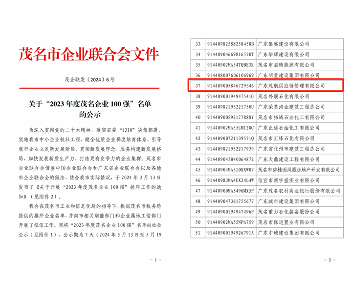 近日,茂名市企業(yè)聯(lián)合會(huì)公布了“2023年度茂名企業(yè)100強(qiáng)”名單,茂名港集團(tuán)下屬全資子公司廣東茂航供應(yīng)鏈管理有限公司榮登排行榜第37名,成功跨入2023年茂名百強(qiáng)企業(yè)行列。