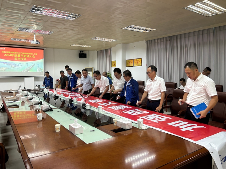 | 9月2號,茂名港博賀新港區(qū)30萬噸級原油碼頭工程召開了2024年“質(zhì)量月”活動啟動儀式。會議由茂名港博賀新港區(qū)30萬噸級原油碼頭項目經(jīng)理部(以下簡稱原油碼頭項目經(jīng)理部)經(jīng)理梁祖釗主持召開,原油碼頭項目經(jīng)理部、中交一航局第二工程有限公司(以下簡稱施工單位)、廣州港工程管理有限公司(以下簡稱監(jiān)理單位)等參建單位參加了本次啟動儀式。