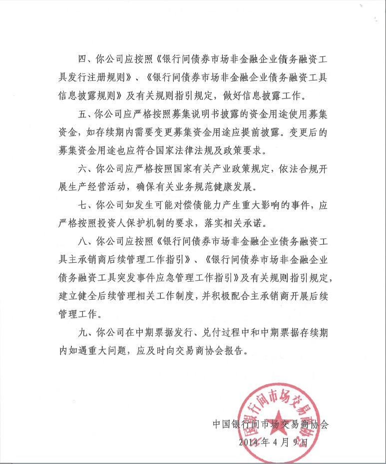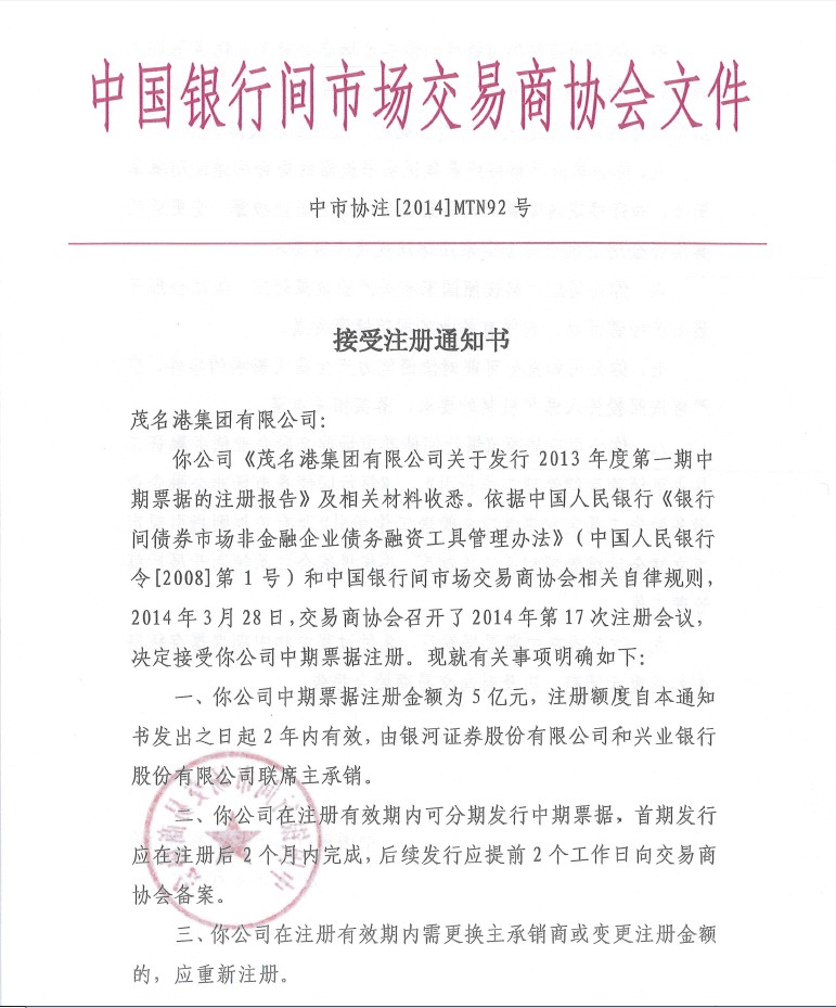 4月14日,茂名港集團收到中國銀行間市場交易商協(xié)會下發(fā)的《接受注冊通知書》,交易商協(xié)會正式?jīng)Q定接受茂名港集團注冊發(fā)行5億元中期票據(jù)。這不僅為茂名港口項目的建設(shè)提供了堅實的資金保障,而且開創(chuàng)了茂名地區(qū)企業(yè)融資創(chuàng)新的先河,將對茂名市企業(yè)開拓直接融資市場具有重大影響。