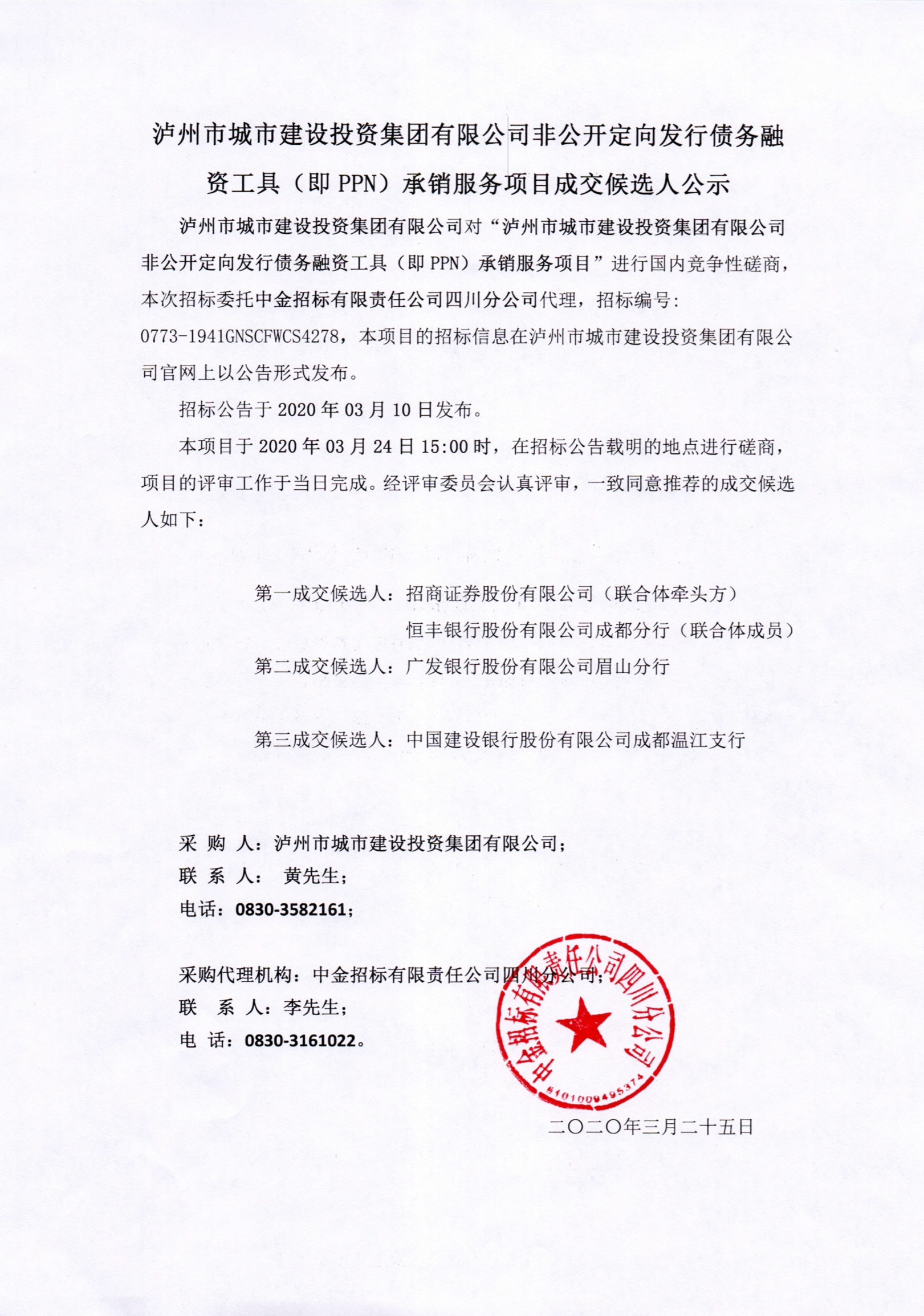 非公開定向發(fā)行債務(wù)融資工具(即PPN)承銷服務(wù)項目成交候選人公示