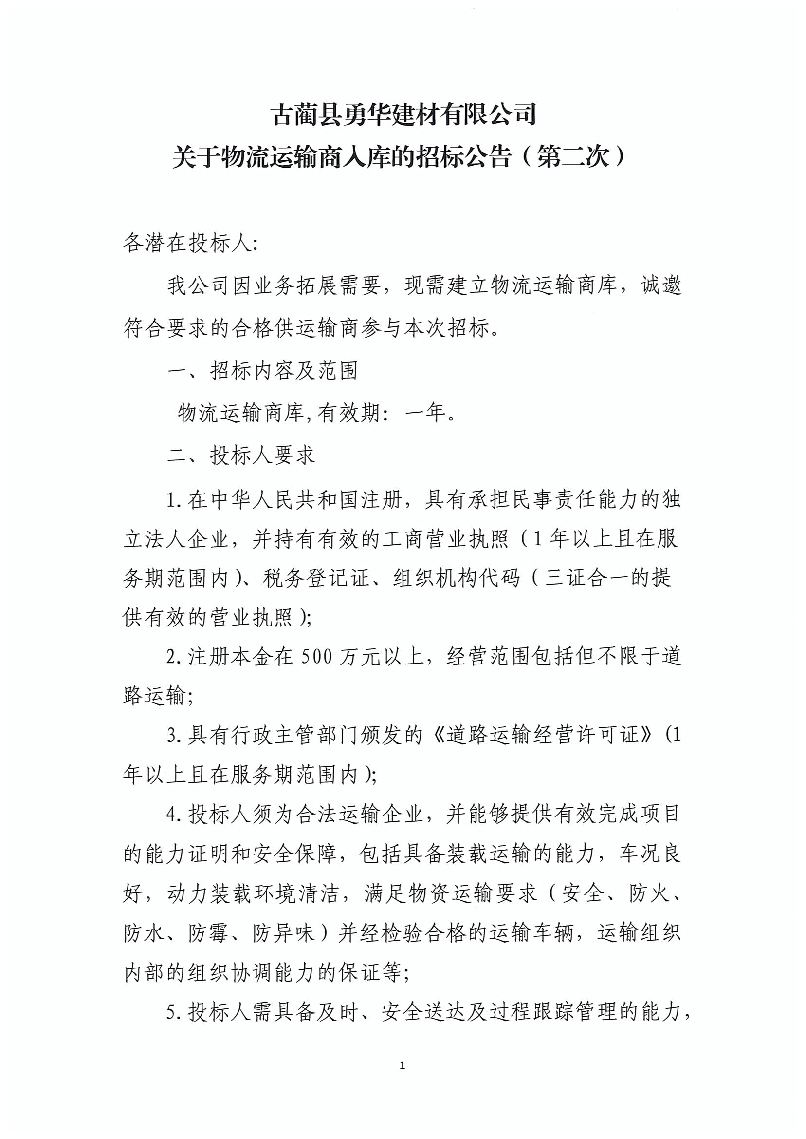 關(guān)于物流運(yùn)輸商入庫的招標(biāo)公告(第二次)