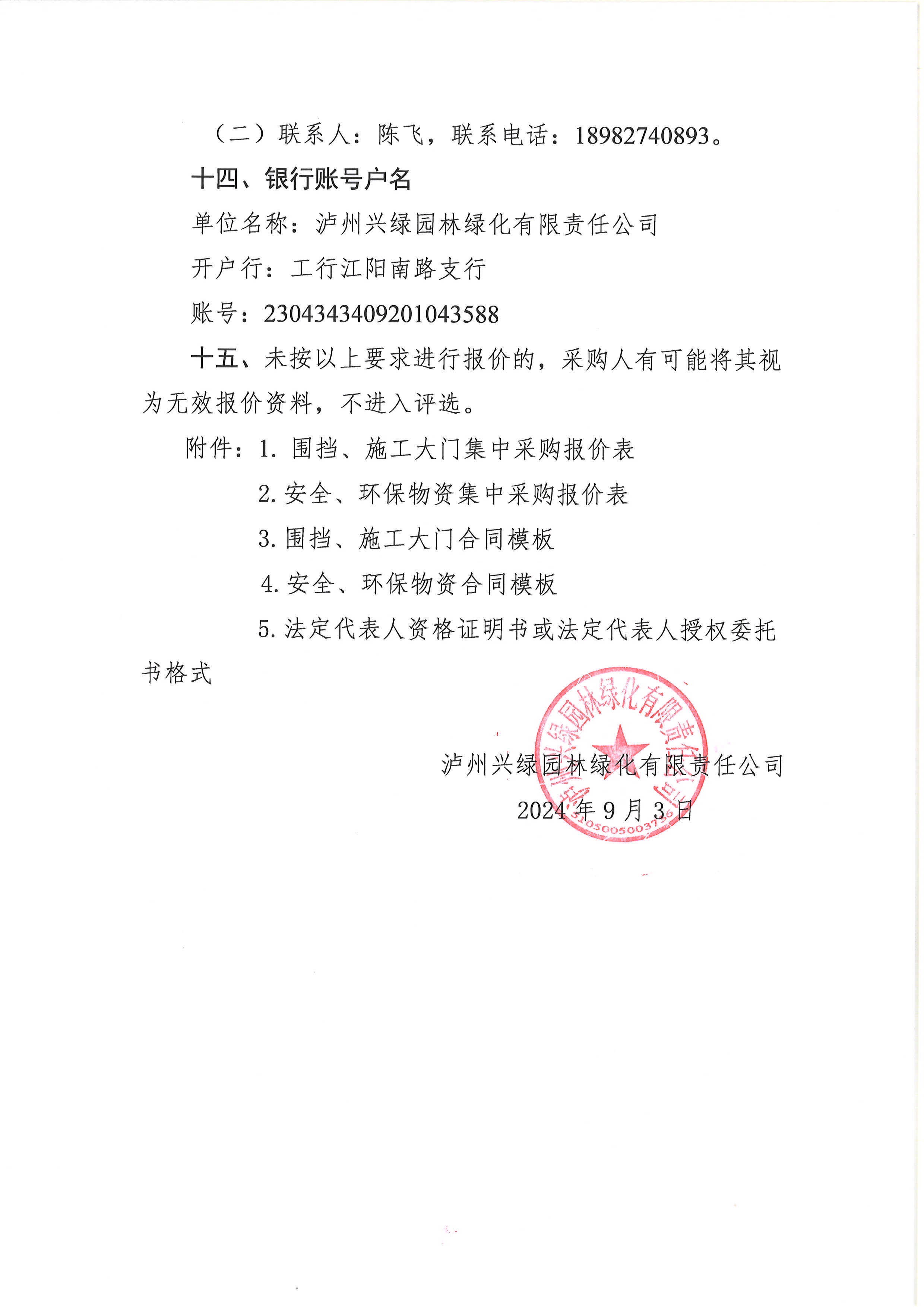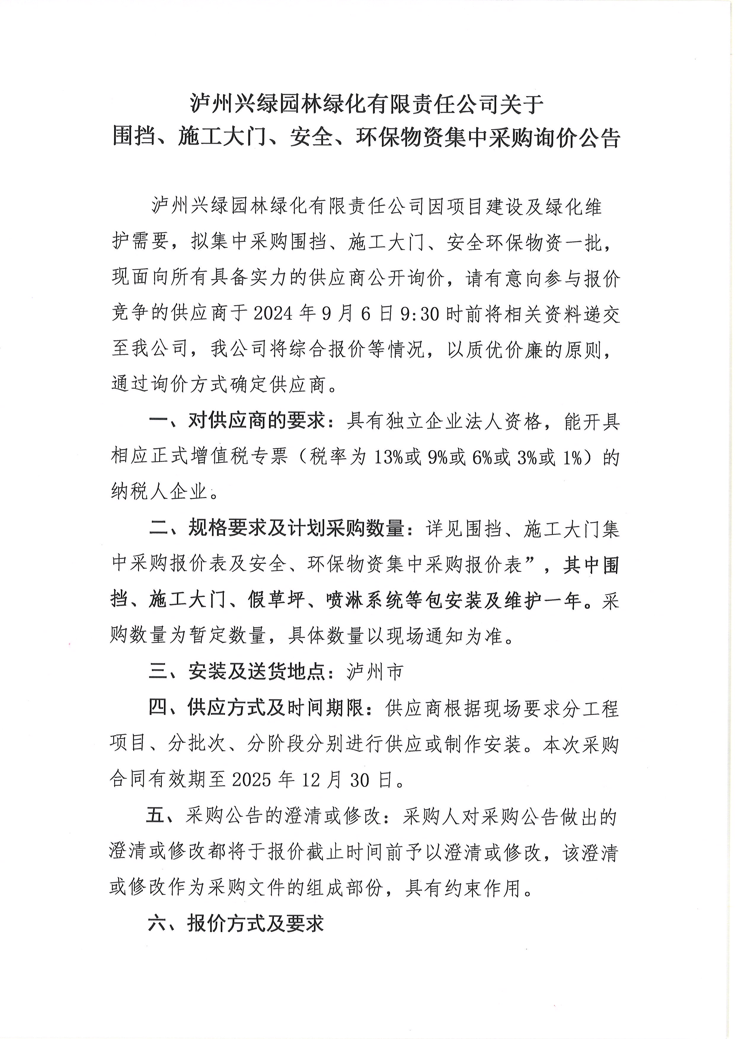 瀘州興綠園林綠化有限責任公司關于圍擋、施工大門、安全、環(huán)保物資集中采購詢價公告